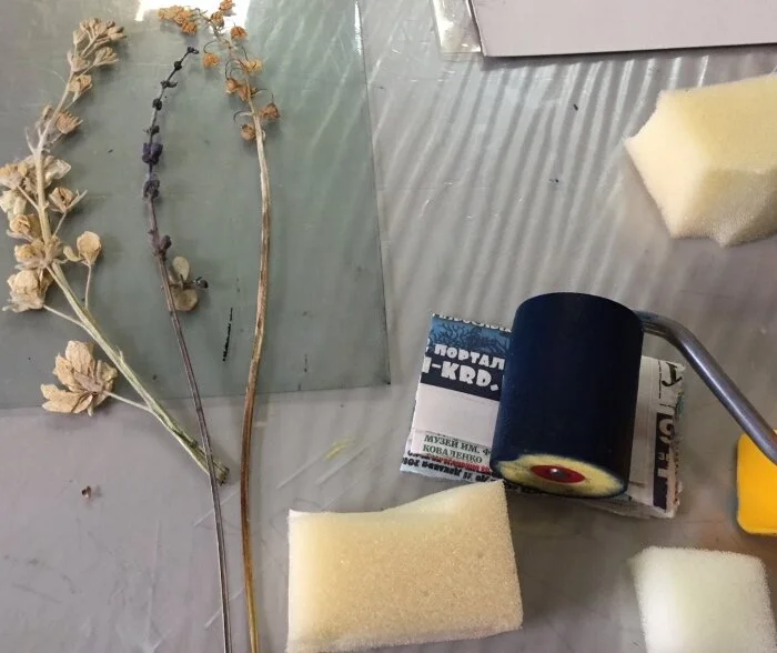 If you choose oil paints - you need to get reed of excessive oils. Just put some amount of oil paint between the pieces of folded newspaper for 30 min. After that you can spread the paint over the plate using the roller or put it over the press-dried flowers with a sponge.